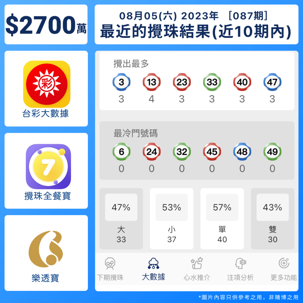 | 2023 [77期] | 11/07/2023(二) | 40, 27, 47, 22, 07, 19 + 13 |