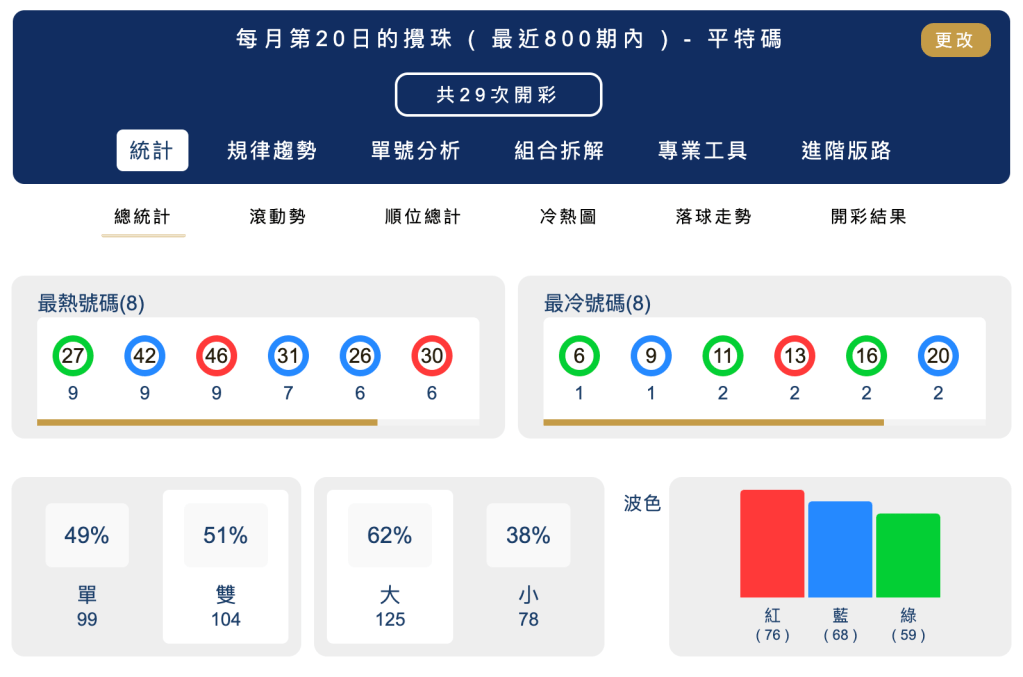 六合彩統計 |每月第20日的攪珠 ( 最近800期內 ) – 平特碼