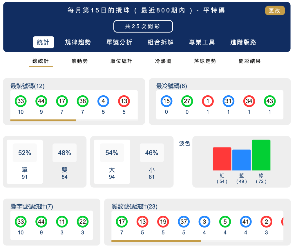 六合彩統計 |每月第15日的攪珠 ( 最近800期內 ) – 平特碼