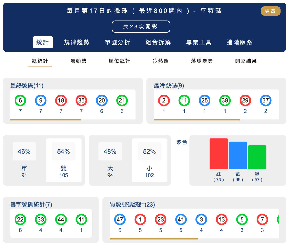 六合彩統計 |每月第17日的攪珠 ( 最近800期內 ) – 平特碼