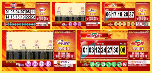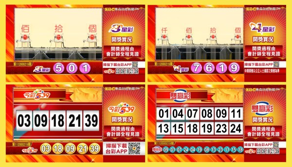 台彩 - 威力彩、今彩539、雙贏彩、4星彩及3星彩等各項開獎獎號。