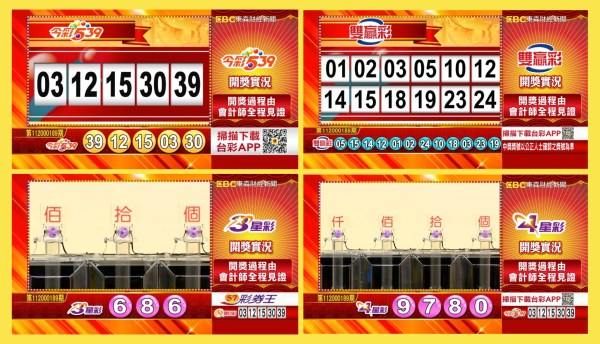 台彩 - 今彩539、雙贏彩、4星彩及3星彩等各項開獎獎號。