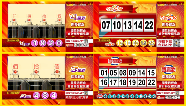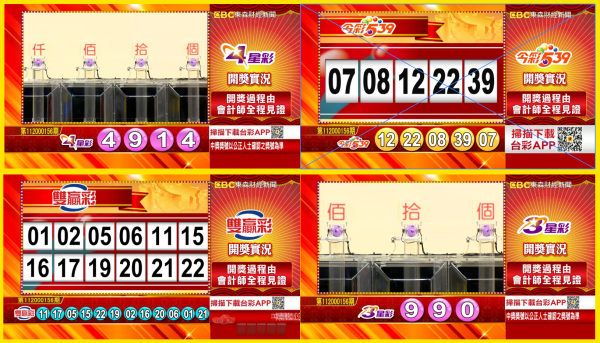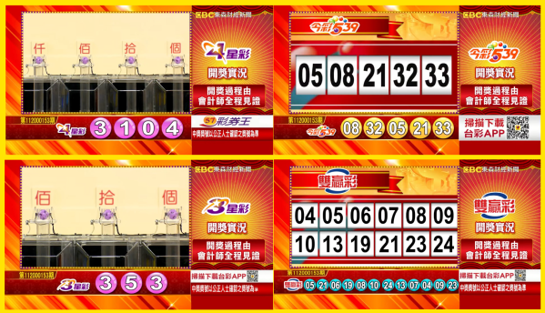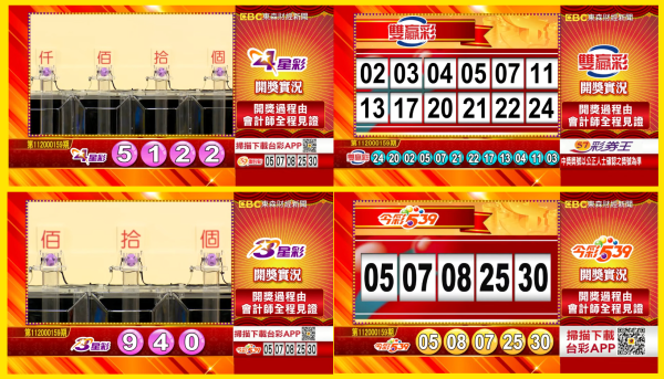 台彩 - 今彩539、雙贏彩、4星彩及3星彩等各項開獎獎號。