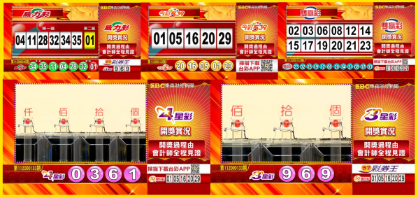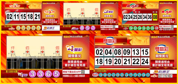 台彩 - 威力彩、今彩539、雙贏彩、4星彩及3星彩等各項開獎獎號。